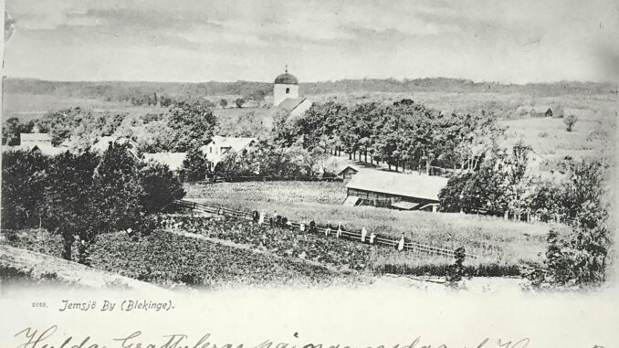 Jemsjö står det tryckt på detta vykort med foto av Alex Jern som bodde i byn vid tiden. Jämjös namn har varierat lite genom tiderna.