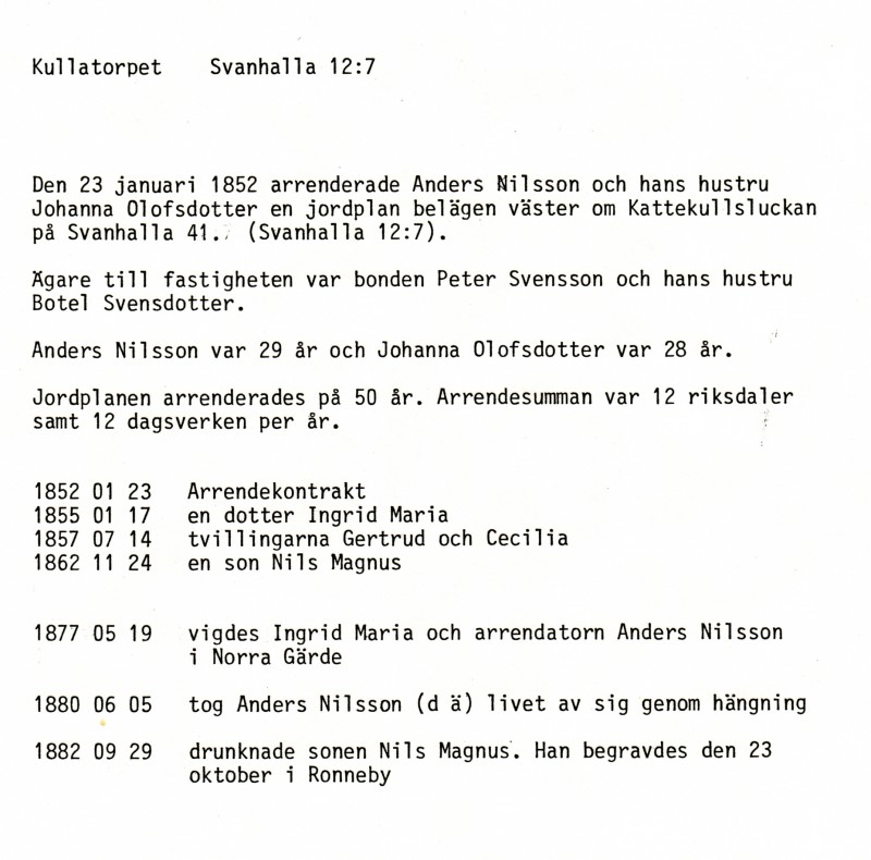 Den 23 januari 1852 arrenderade Anders Nilsson och hans hustru Johanna Olofsdotter en jordplan belägen väster om Kattekullsluckan på Svanhalla no 41, nuvarande Svanhalla 12:7.
