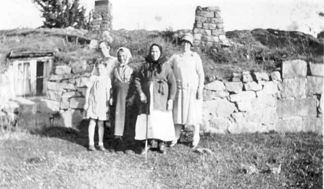 Hanna Matilda Holgersson f.1898, den lilla flickan framför Hanna bör vara dottern Astrid Elisabeth, den gamla kvinnan närmast Hanna och Astrid bör vara Hannas mor Karolina, de övriga är okända.